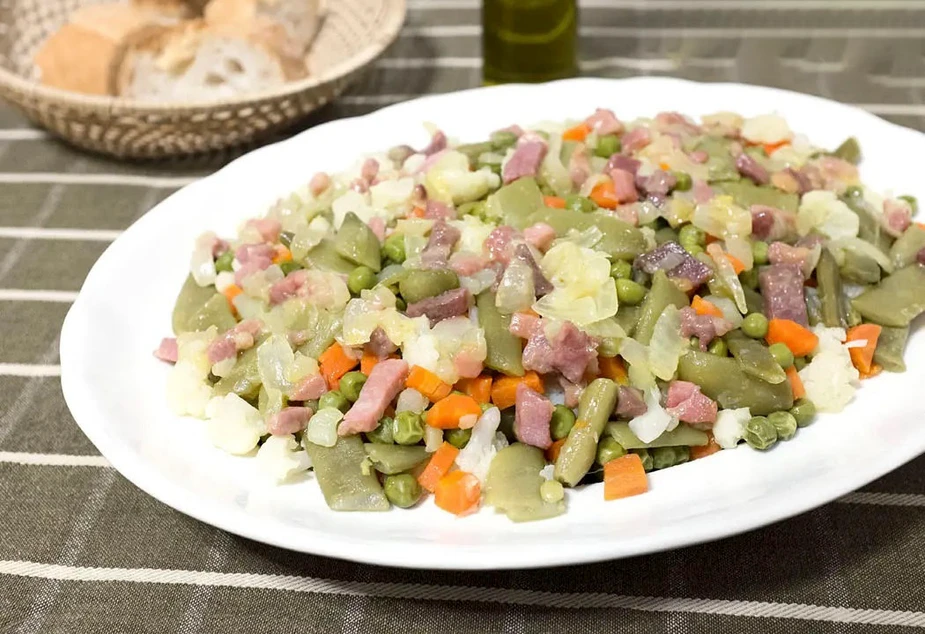 Podemos emplear todo tipo de verduras, por ejemplo alcachofas, coles de Bruselas, patata, espárragos, cebolletas, judías verdes, guisantes, habitas, espinacas, borrajas, calabacines, aparte del jamón, que si es ibérico mucho mejor, obviamente.